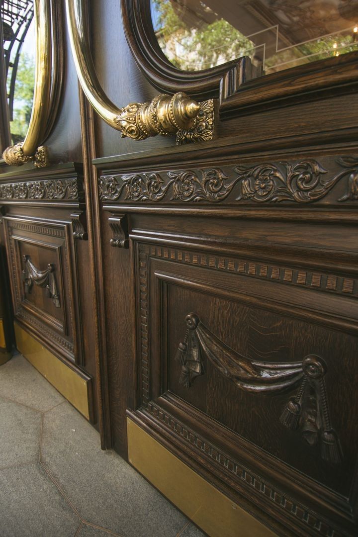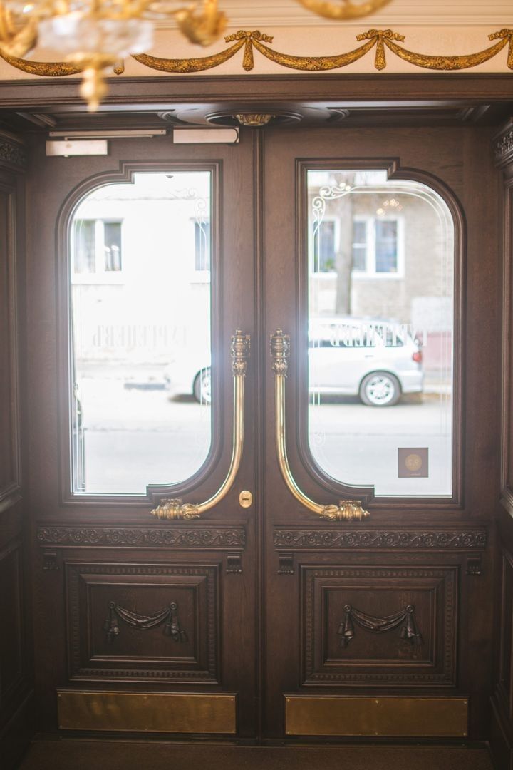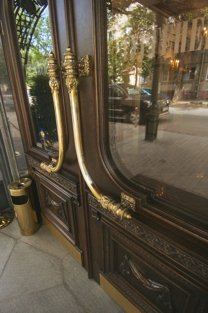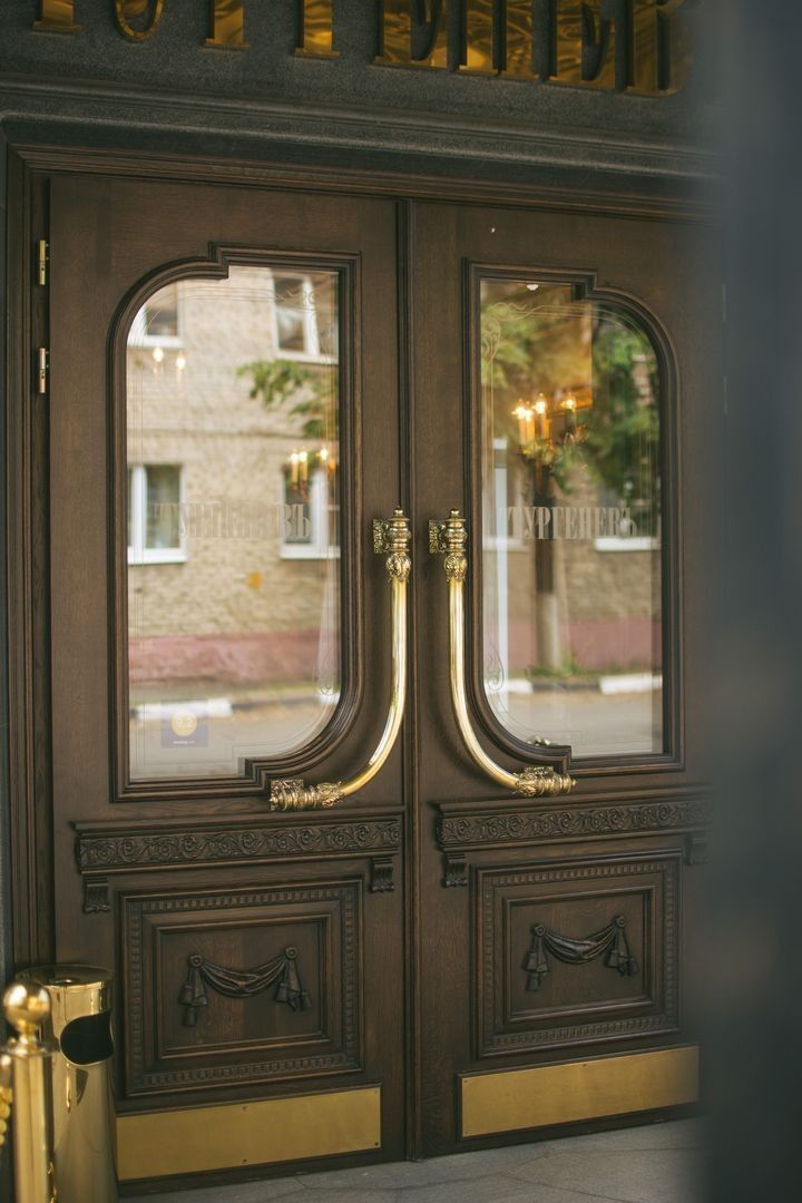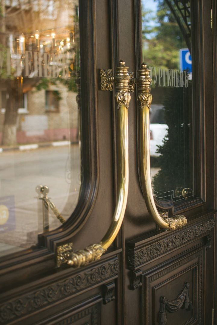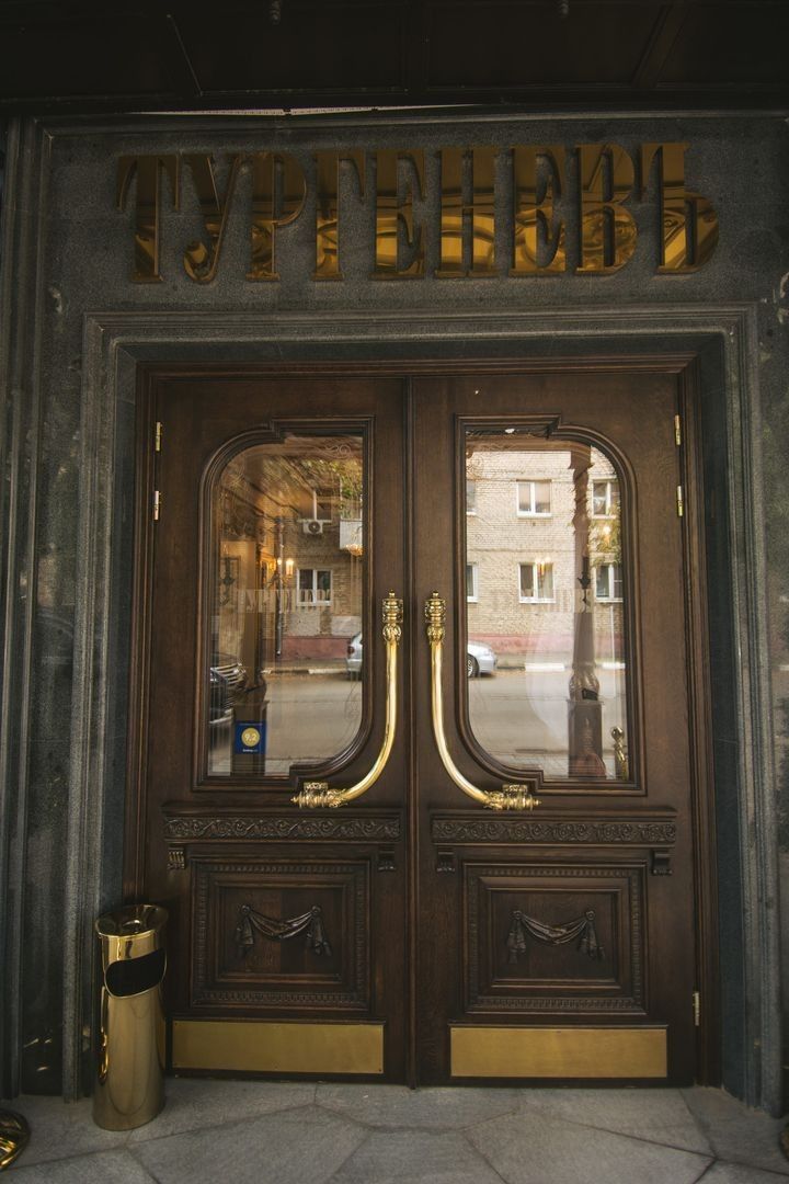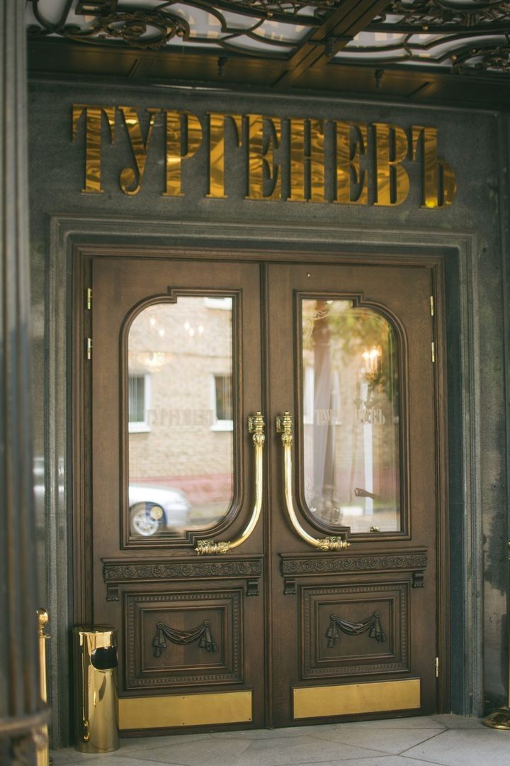 Великолепная дверь ручной работы украшает вход, в ресторан "ТургеневЪ"
